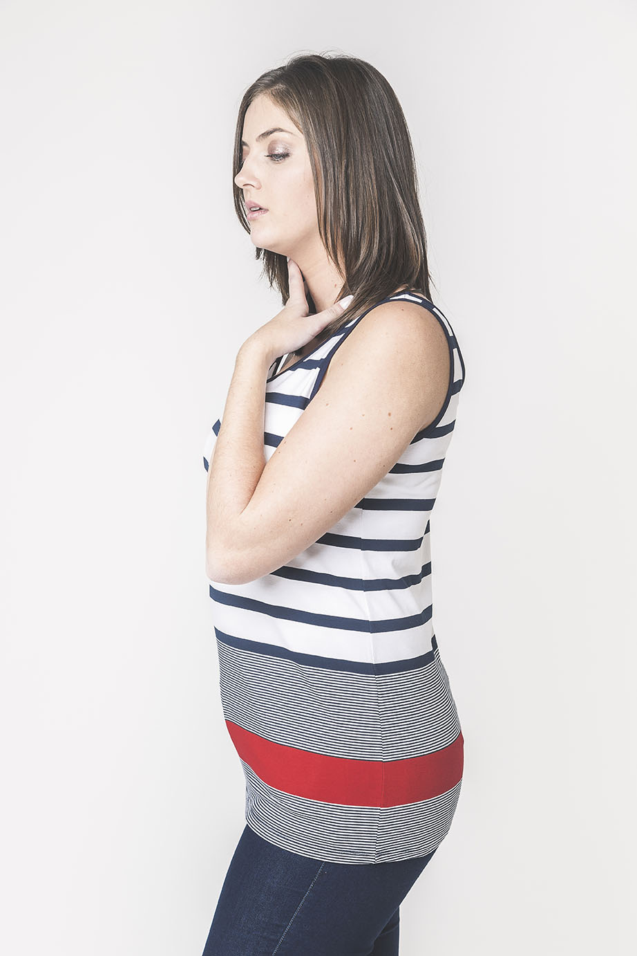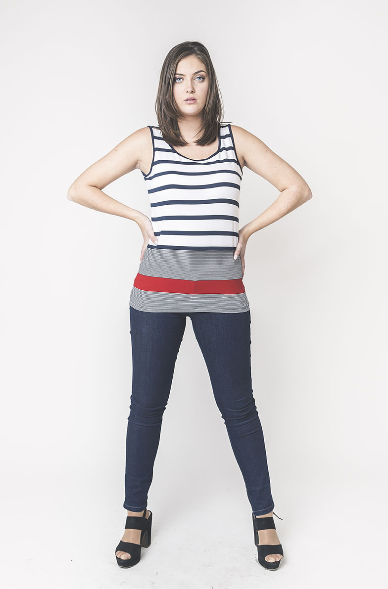 TOP TIRANTE EN VISCOSA CON RAYA DESIGUAL ROJA